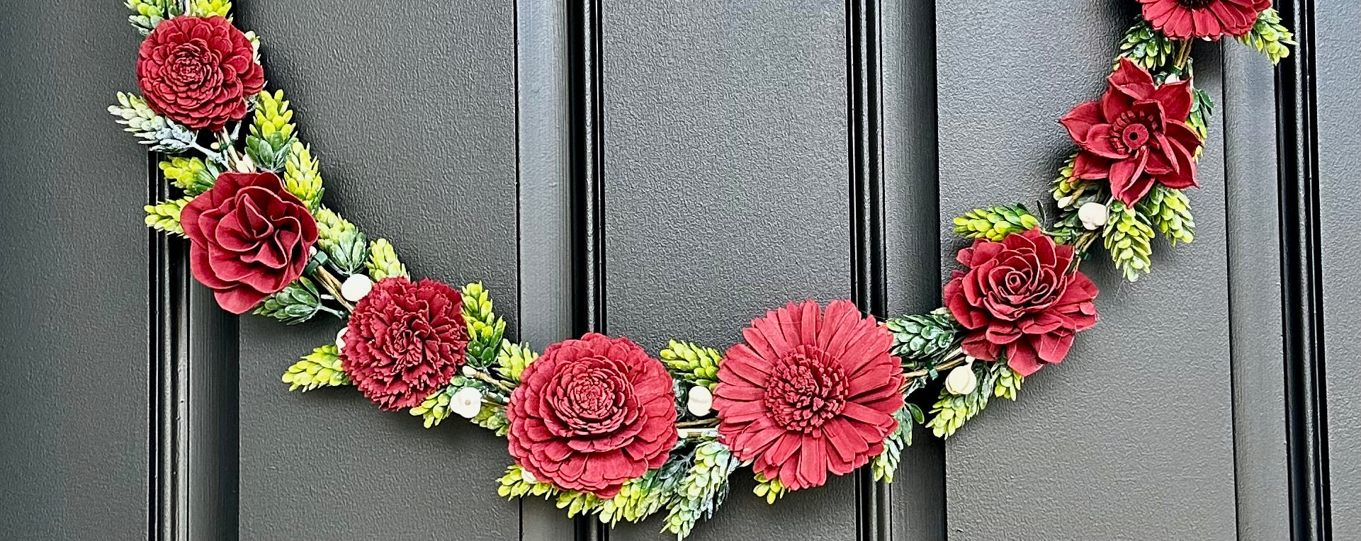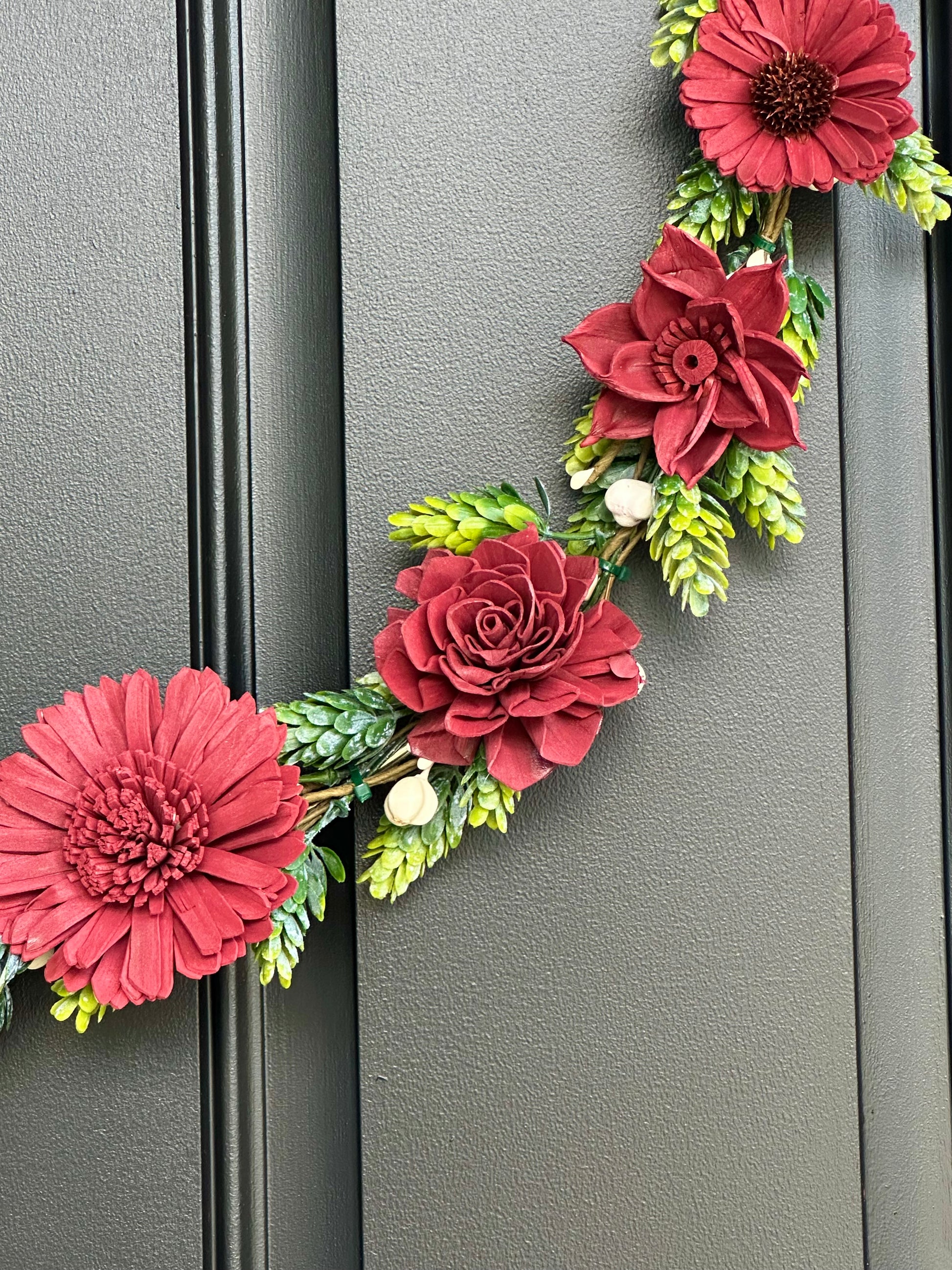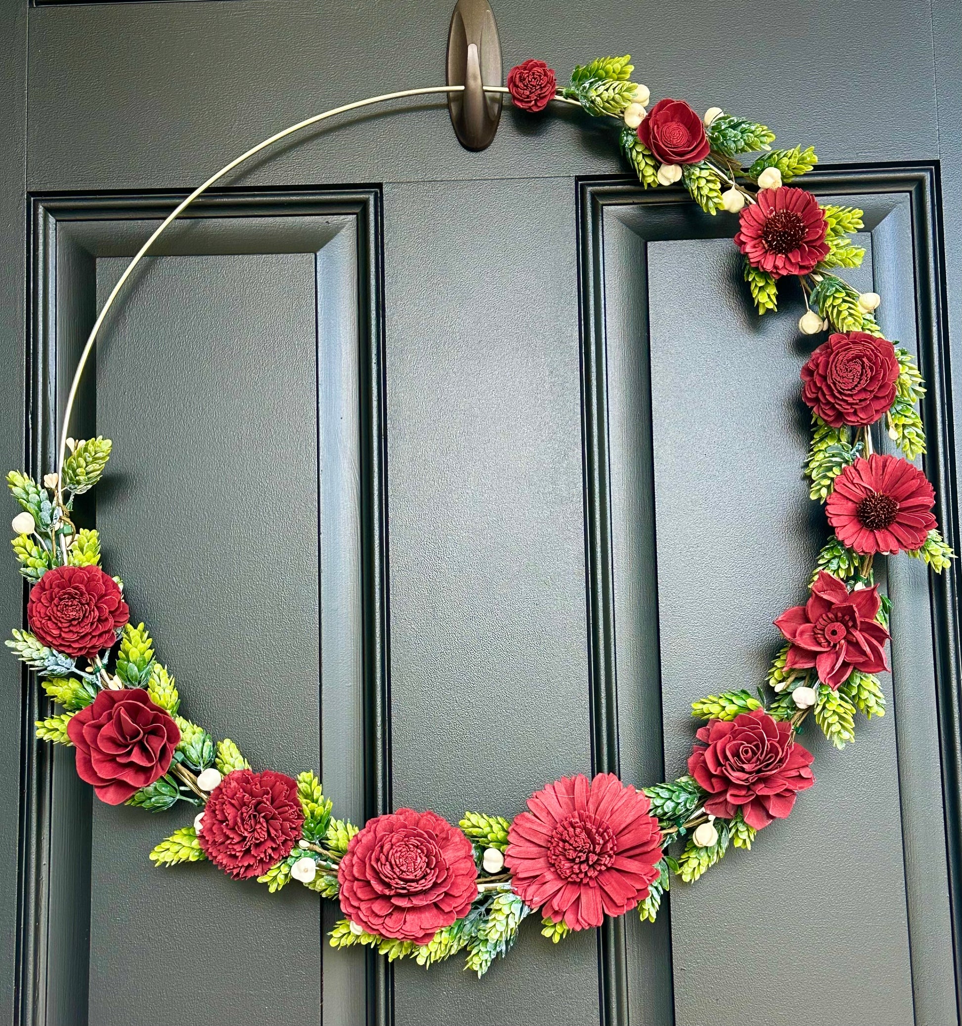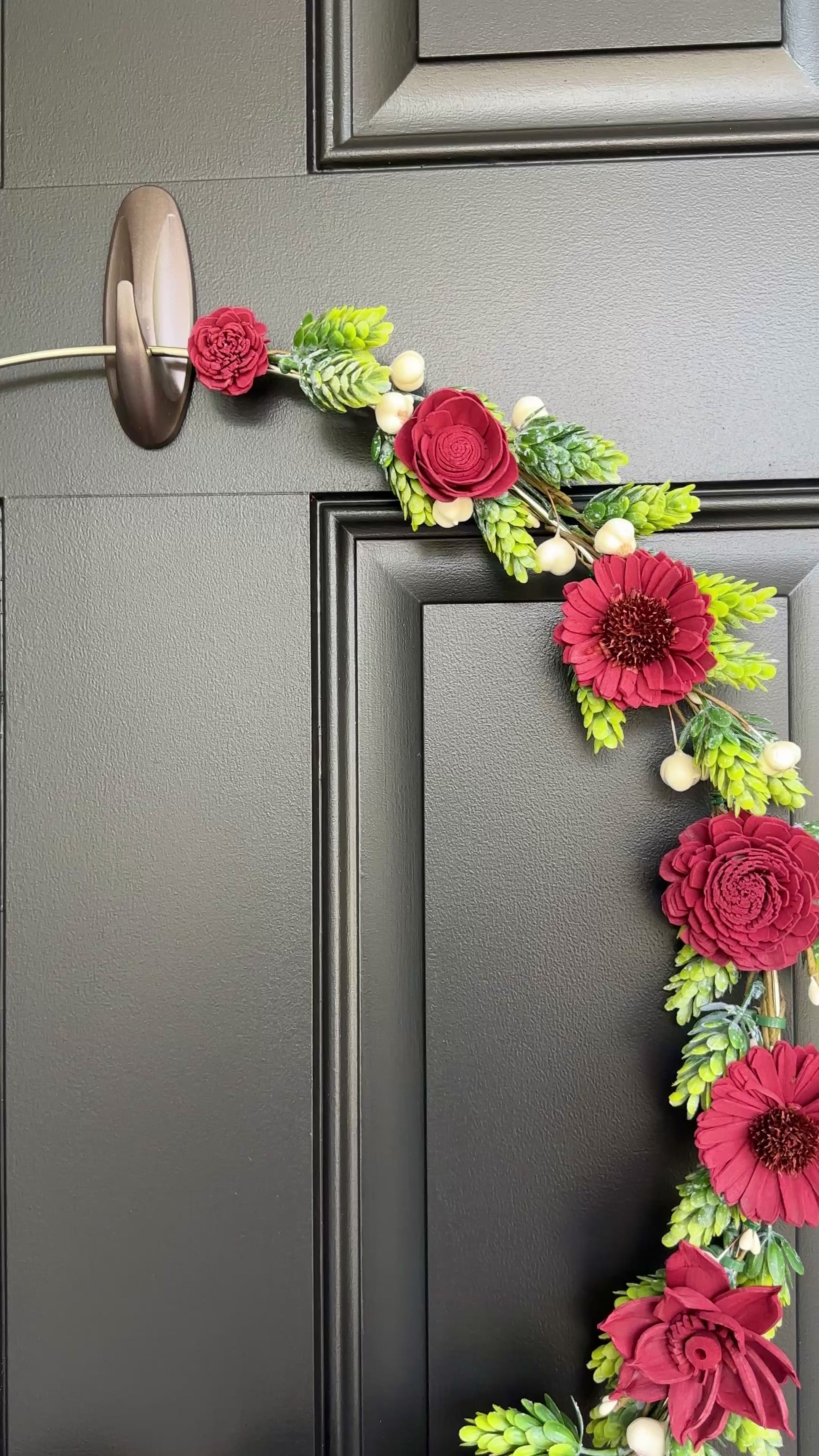 Transform your home with this gorgeous Fall-inspired wreath handcrafted with burgundy dyed sola wood flower, ivory berry stems and faux green-frosted hops vine.