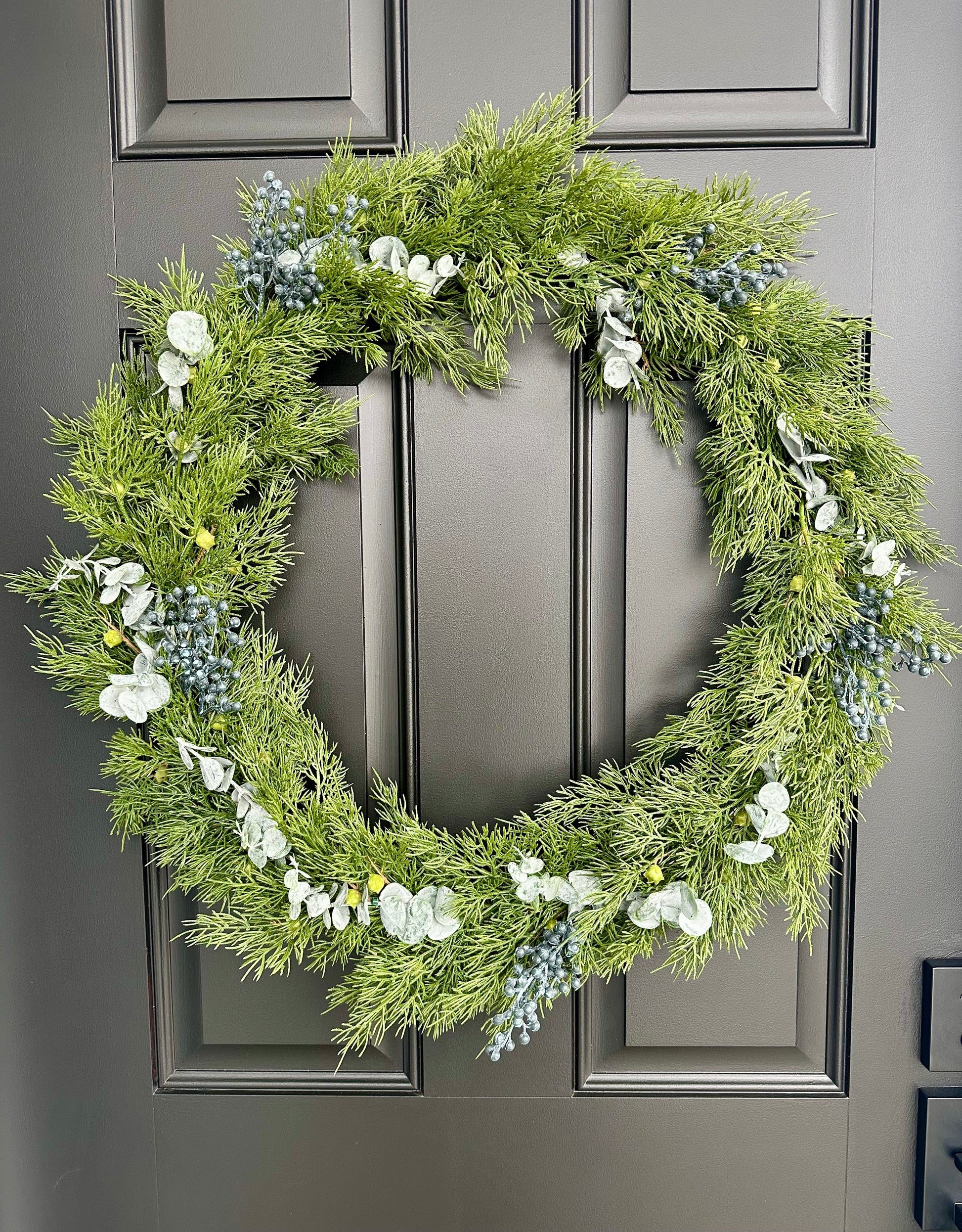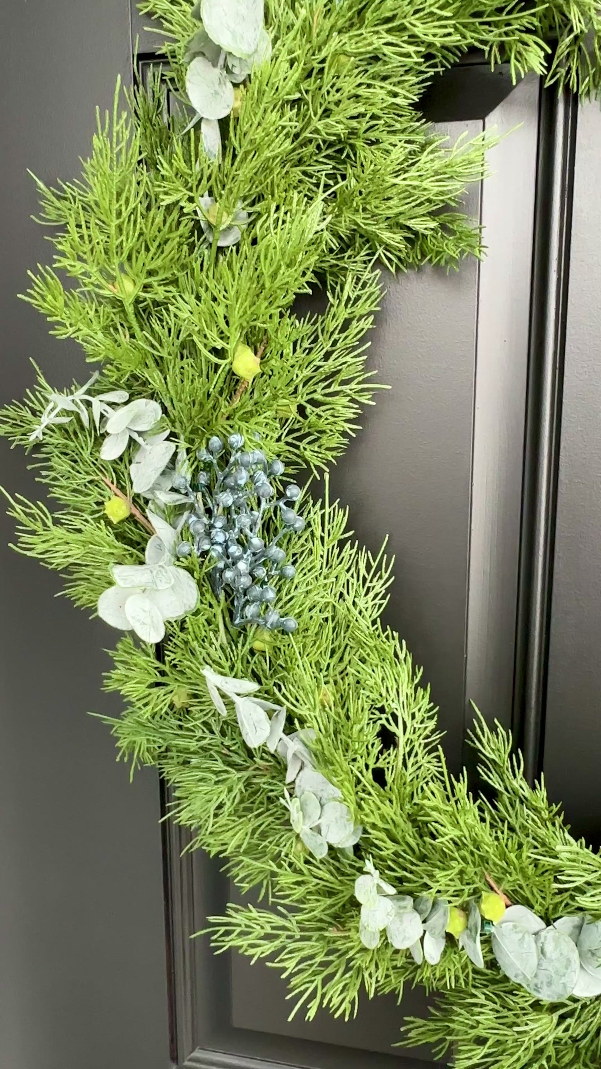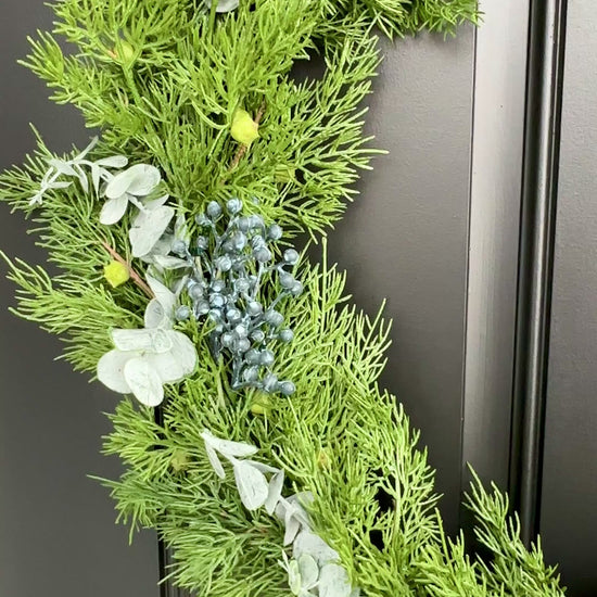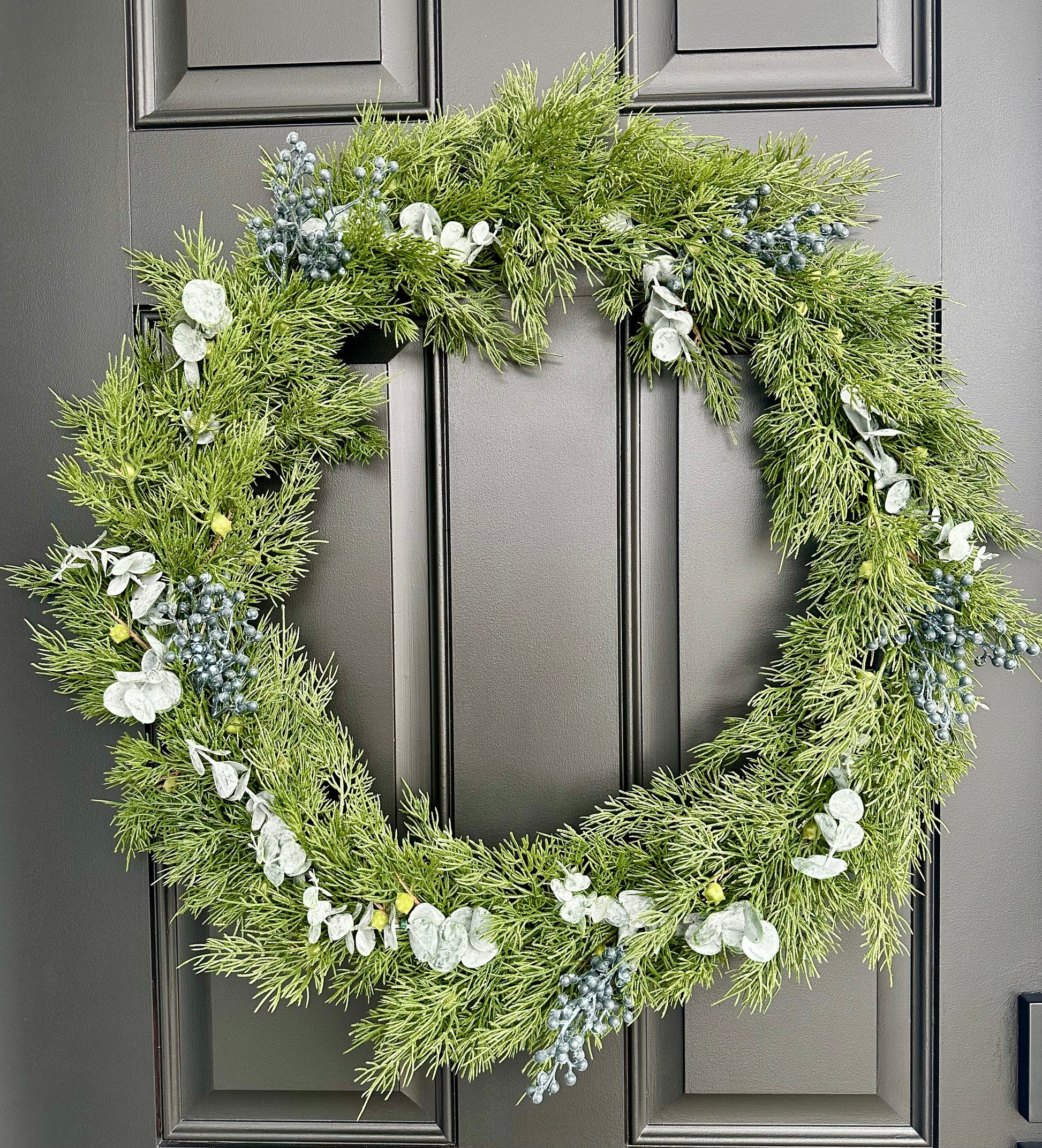 Create an unforgettable holiday impression with this beautifully crafted wreath. Made with premium faux botanicals including juniper cedar pine and eucalyptus accented with vibrant blueberry clusters.