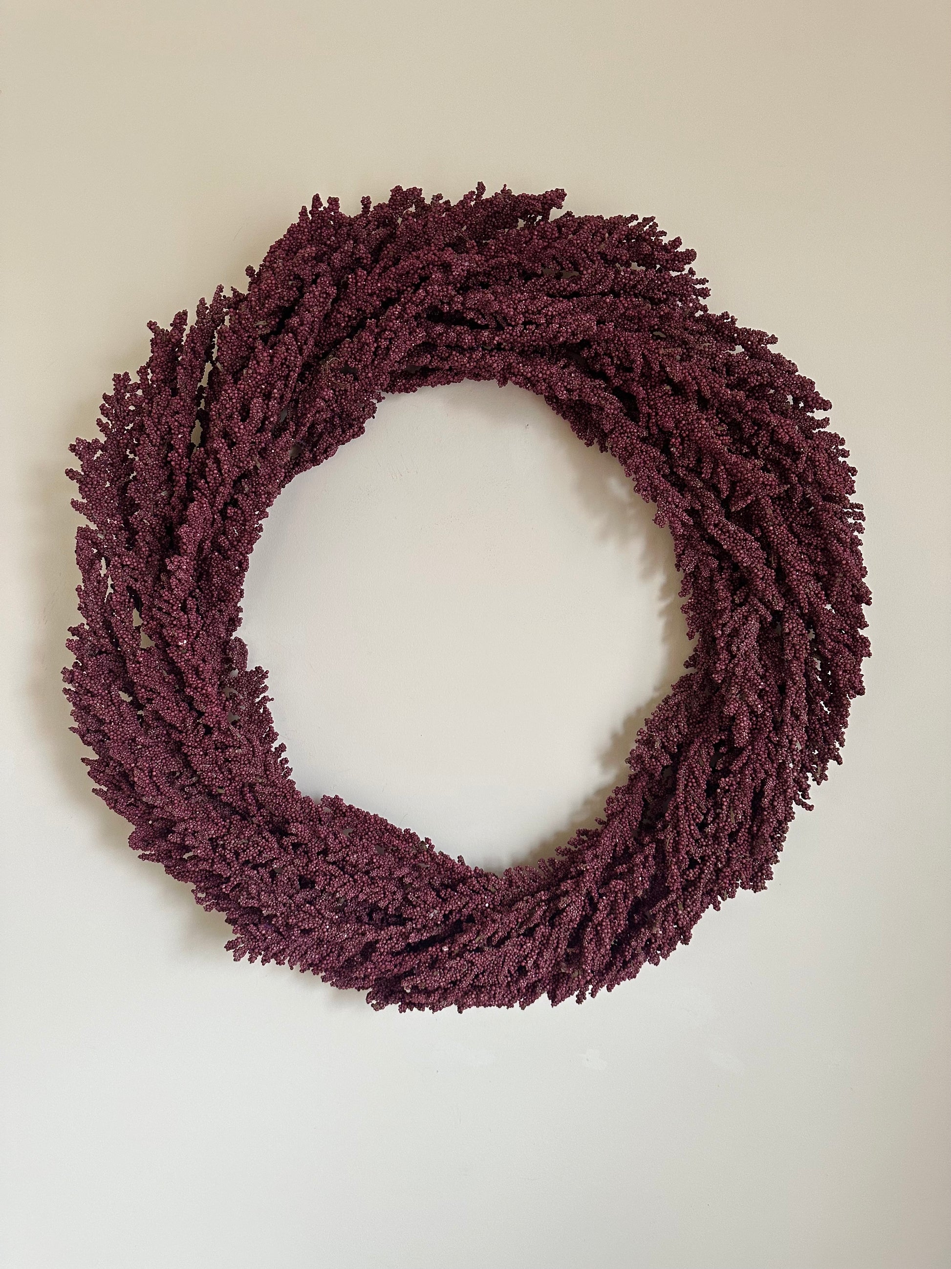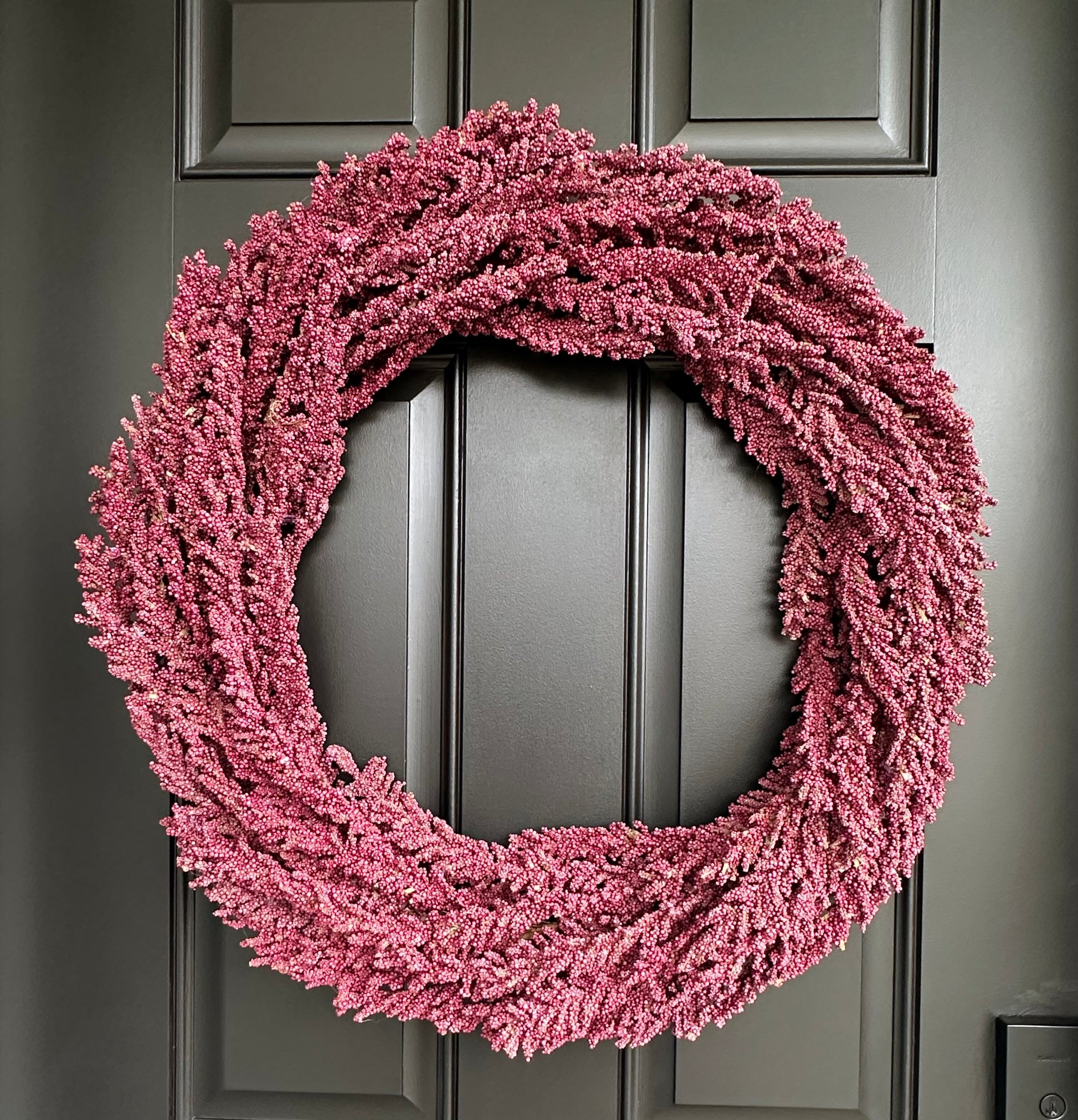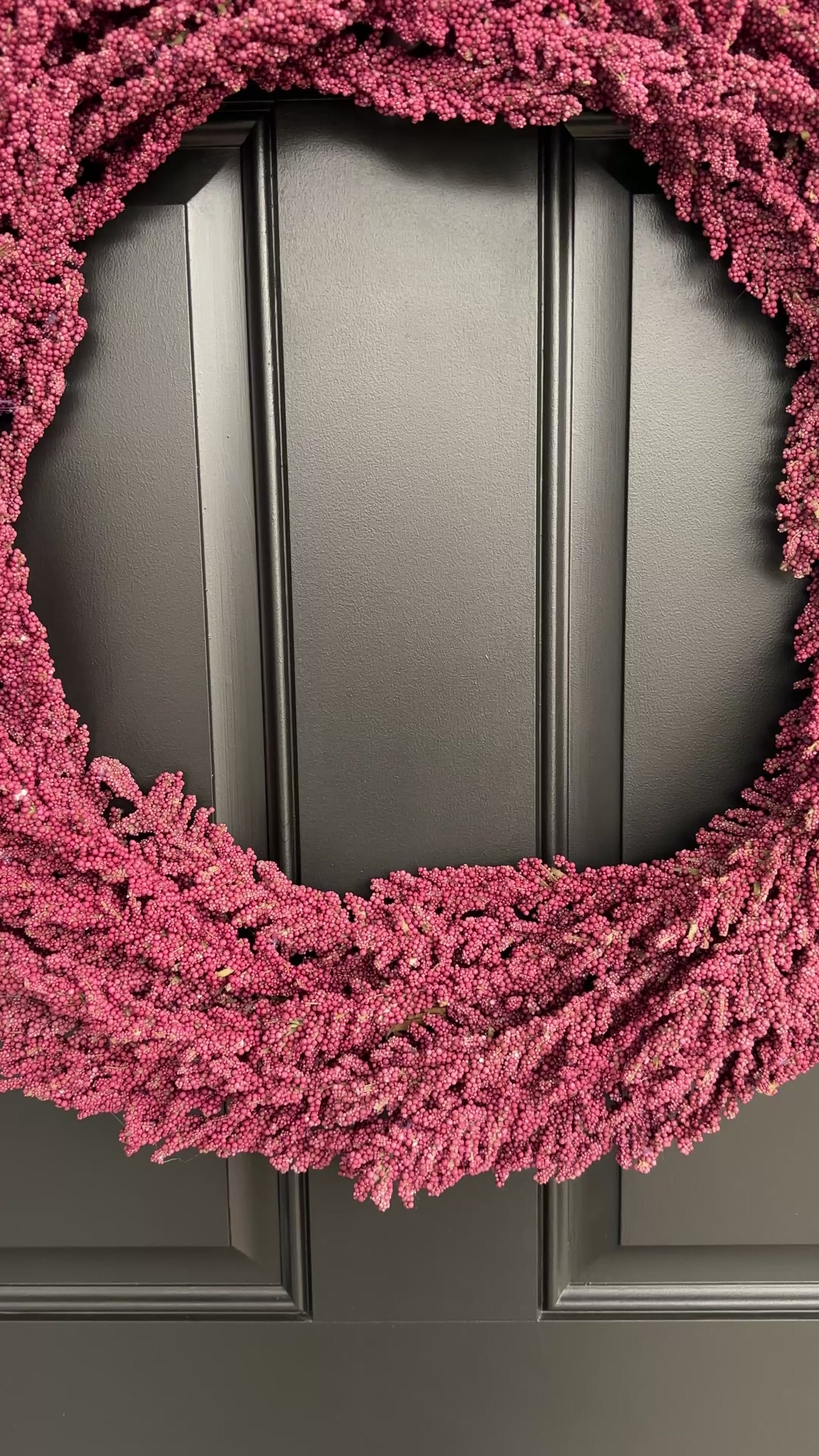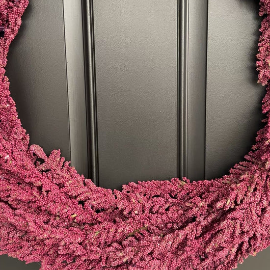 Our handcrafted wreath is carefully designed to create a visually stunning focal point in your home. It's the perfect addition to any door, wall or mantel. Made with faux Mulberry Heather bush.