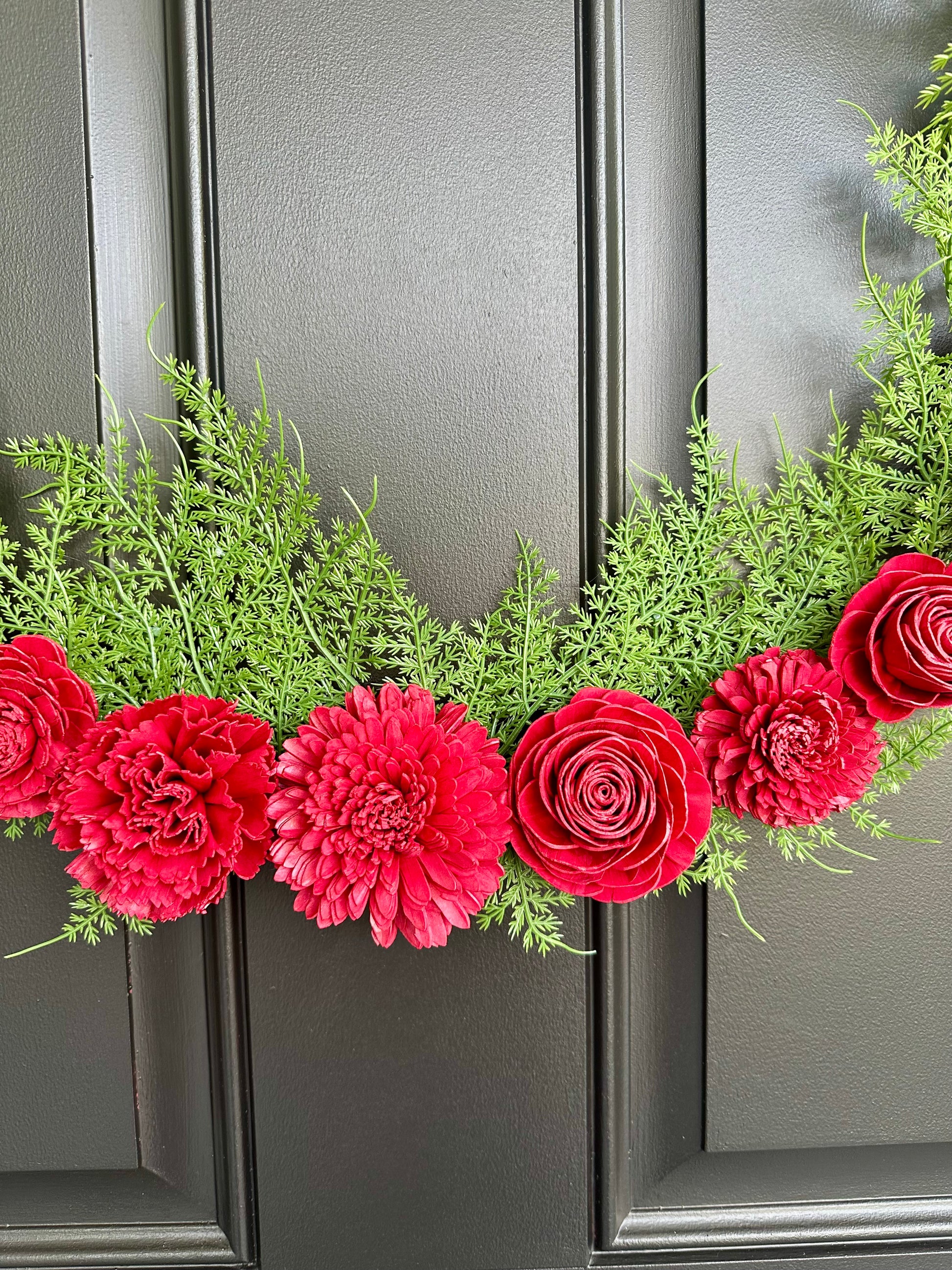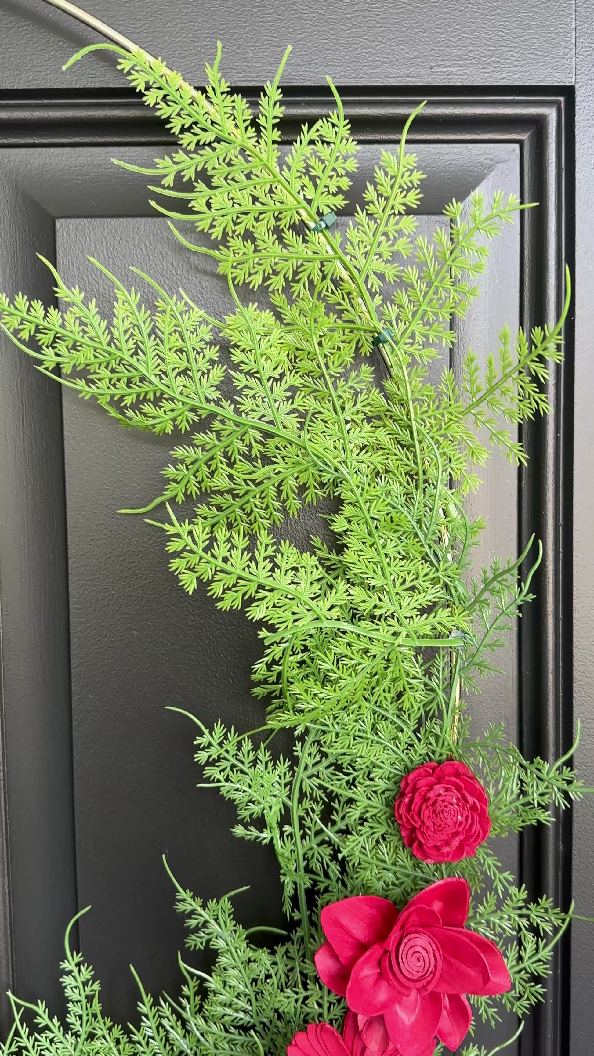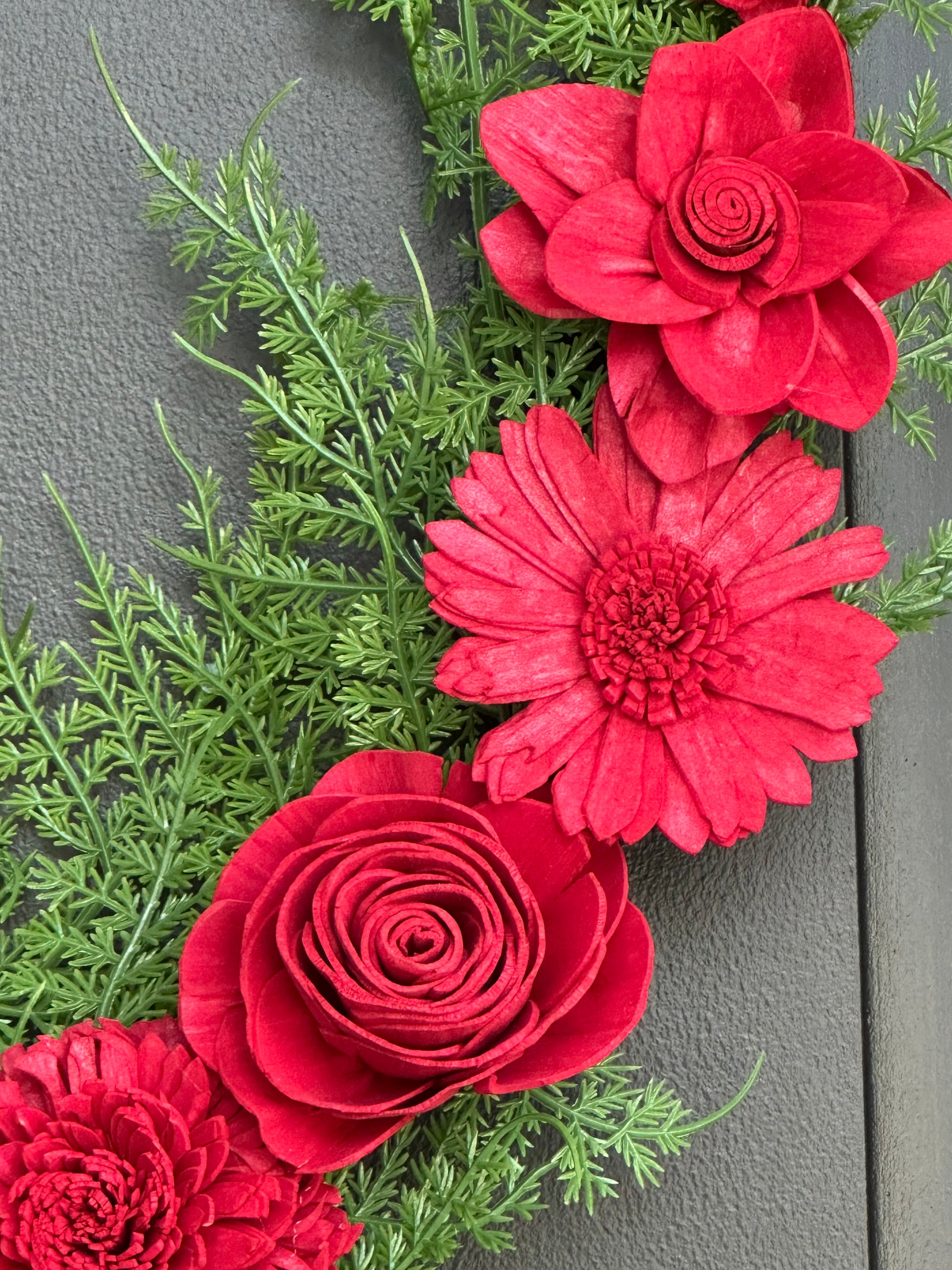 Fall in love with our beautiful modern wreath handcrafted in cherry red sola wood flowers and wispy styled green faux fern bush. Can be displayed all year round to add a pop of color to your home decor.