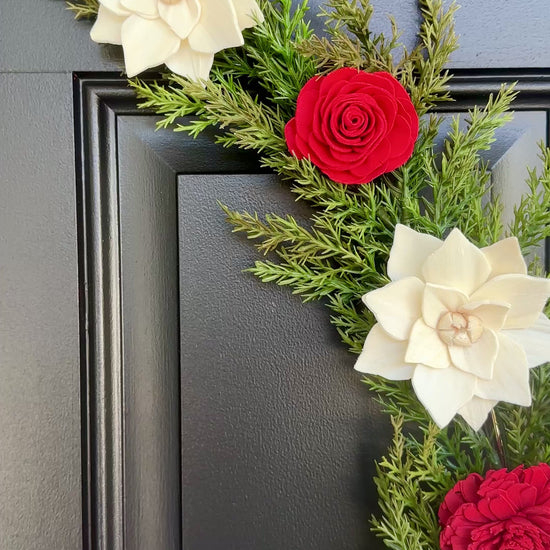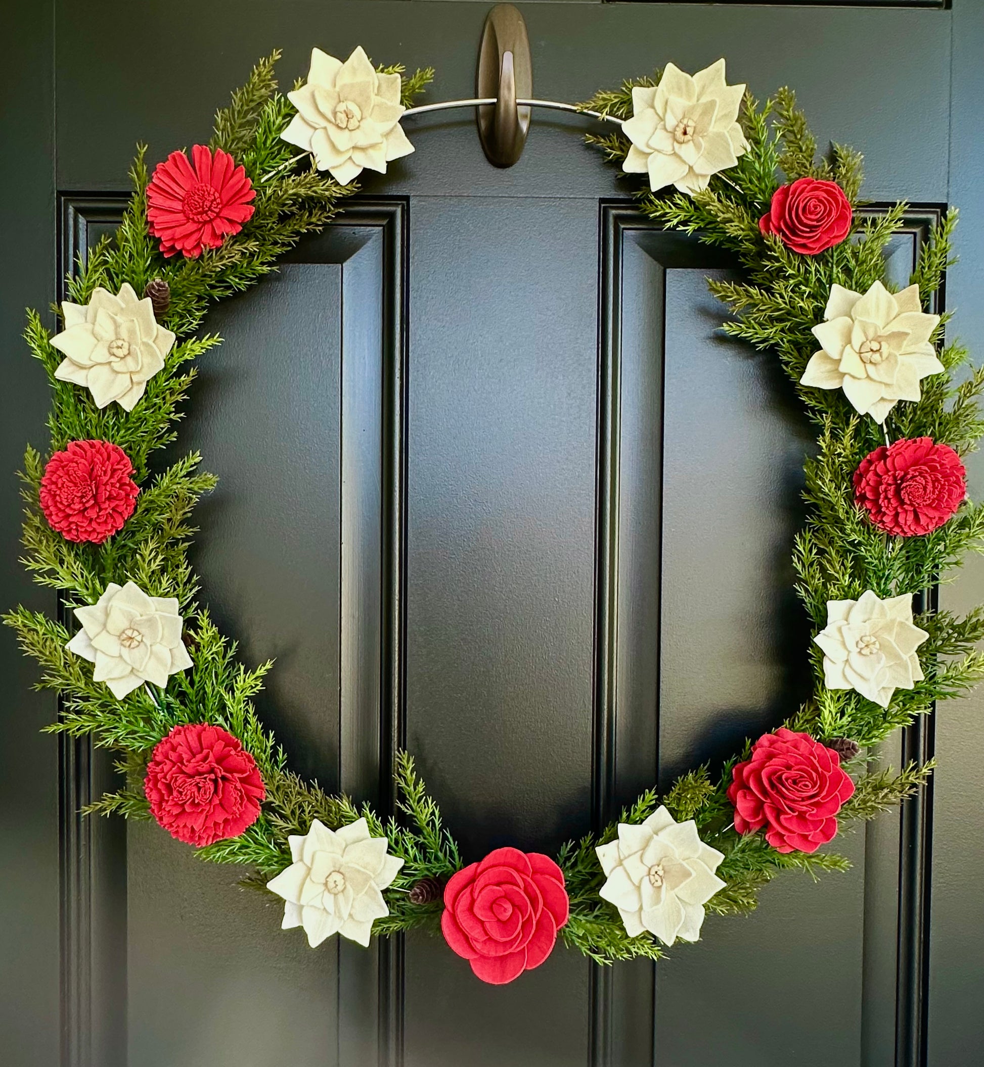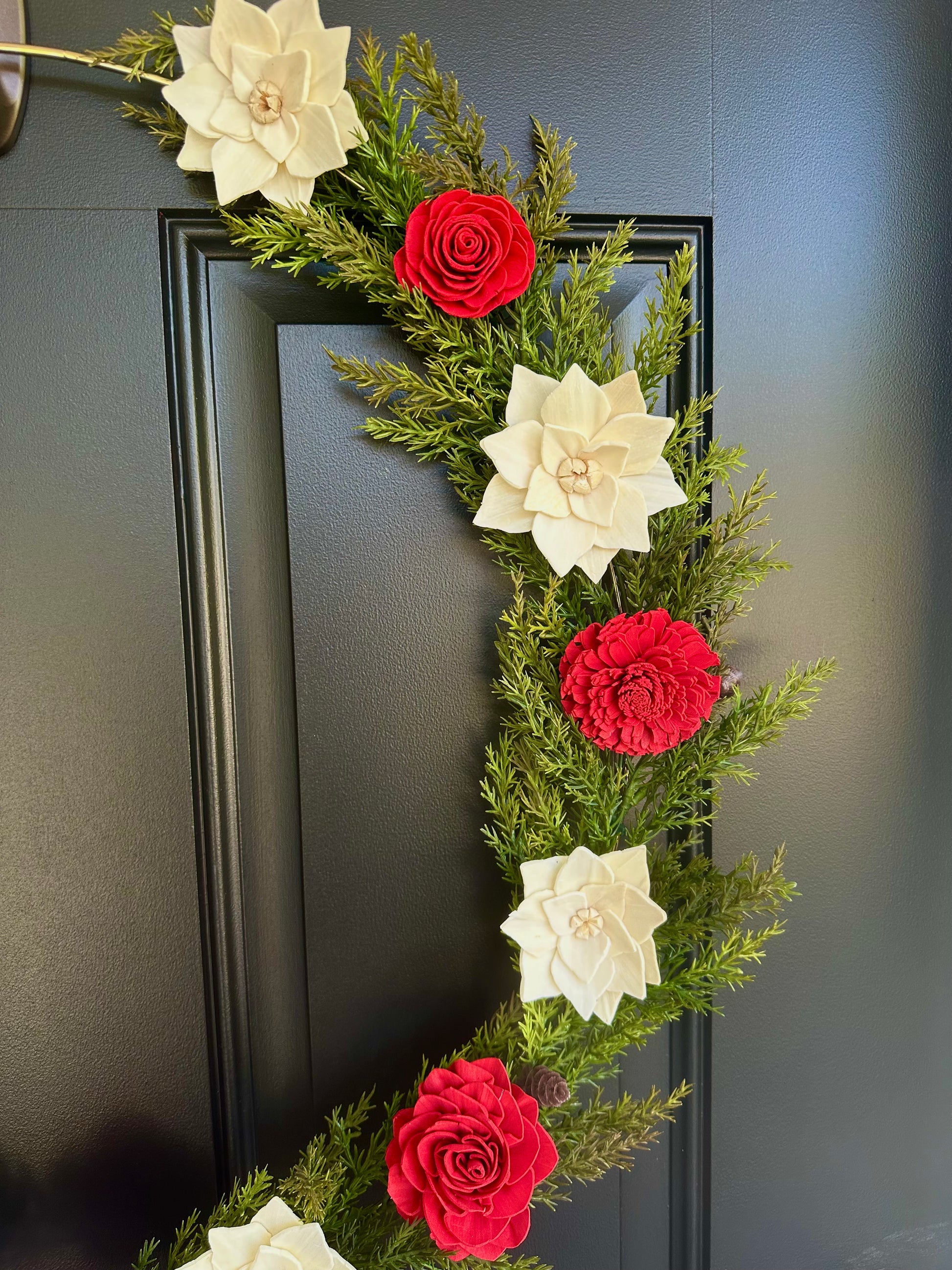 Add our festive Christmas wreath to your holiday decor. Handcrafted with Ivory Poinsettia and Ruby-dyed sola wood flower and faux lush evergreen Cyprus bush with little pine-cones.