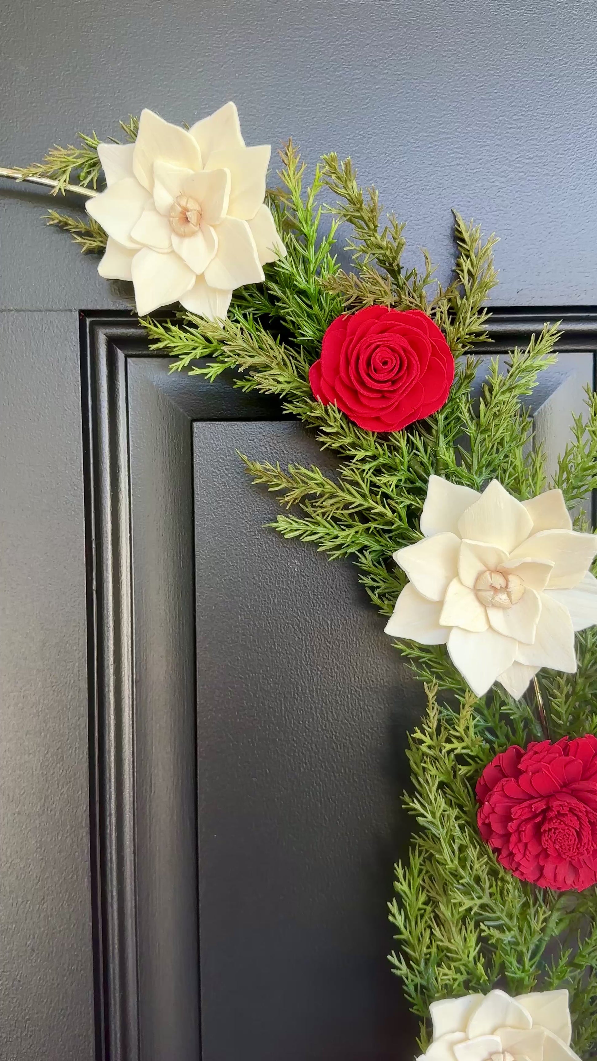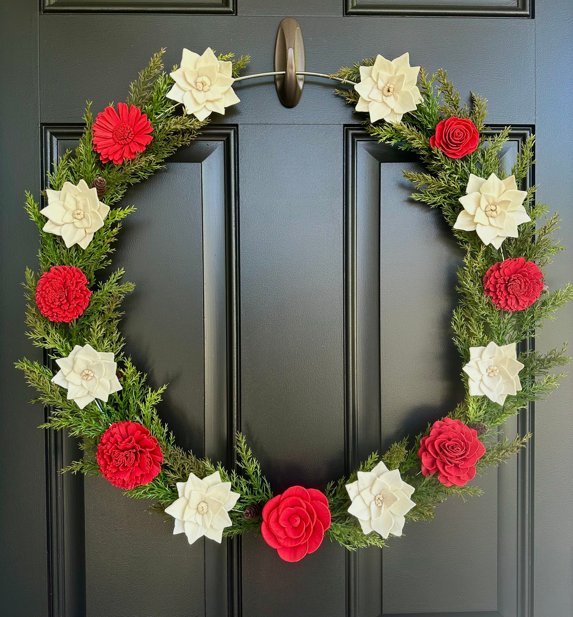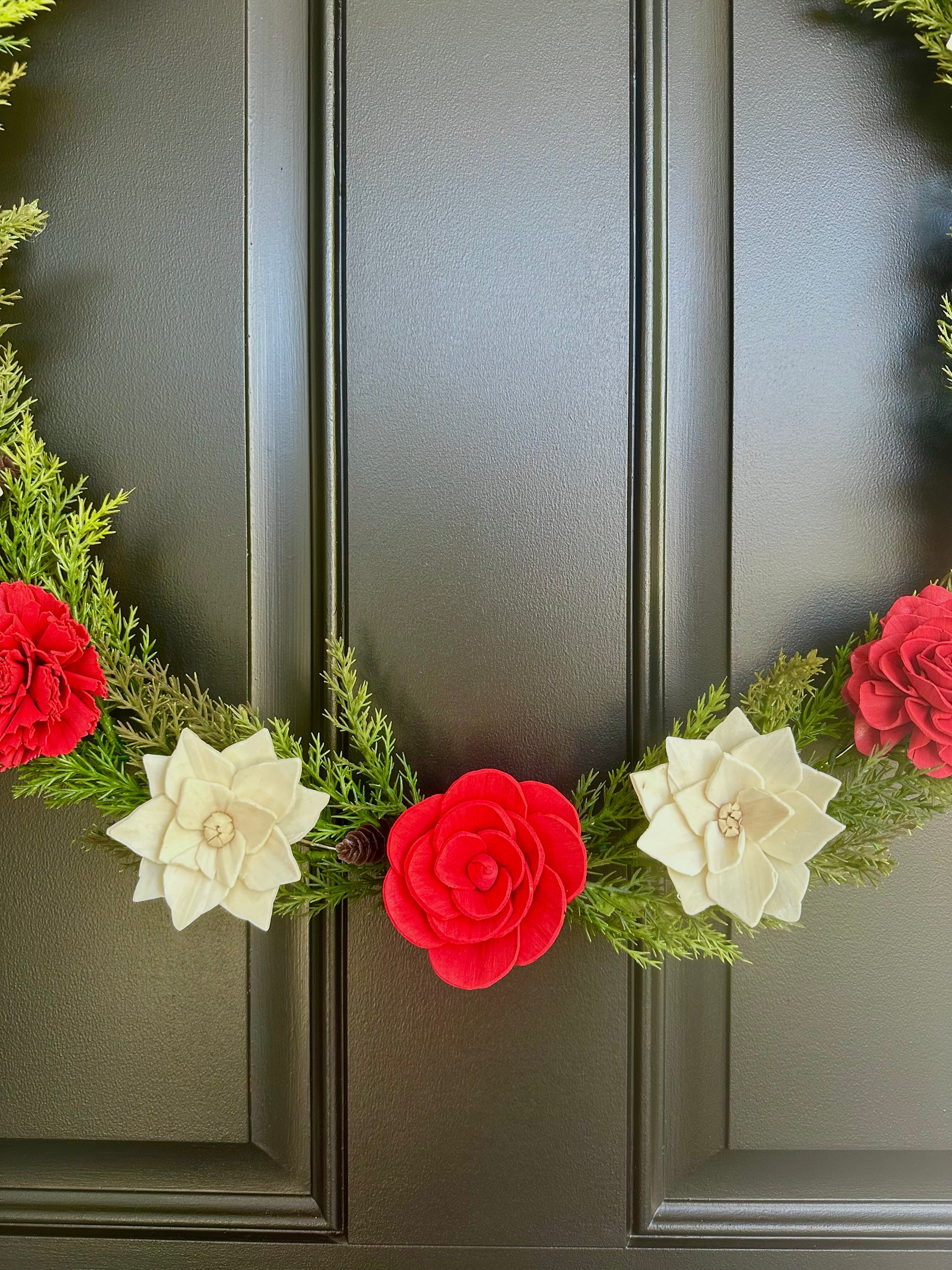 Add our festive Christmas wreath to your holiday decor. Handcrafted with Ivory Poinsettia and Ruby-dyed sola wood flower and faux lush evergreen Cyprus bush with little pine-cones.