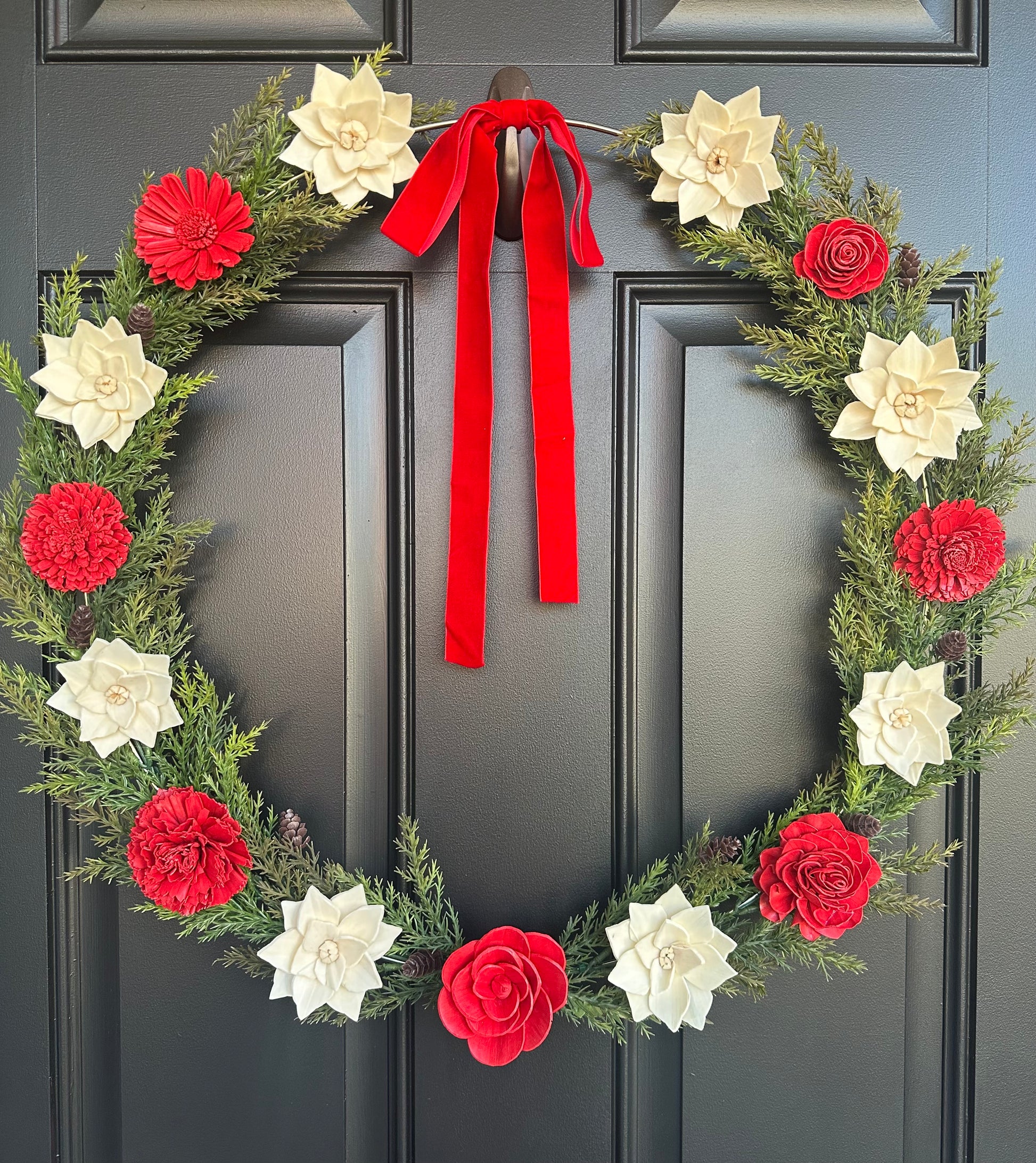 Add our festive Christmas wreath to your holiday decor. Handcrafted with Ivory Poinsettia and Ruby-dyed sola wood flower and faux lush evergreen Cyprus bush with little pine-cones. Available with or without the red bow.