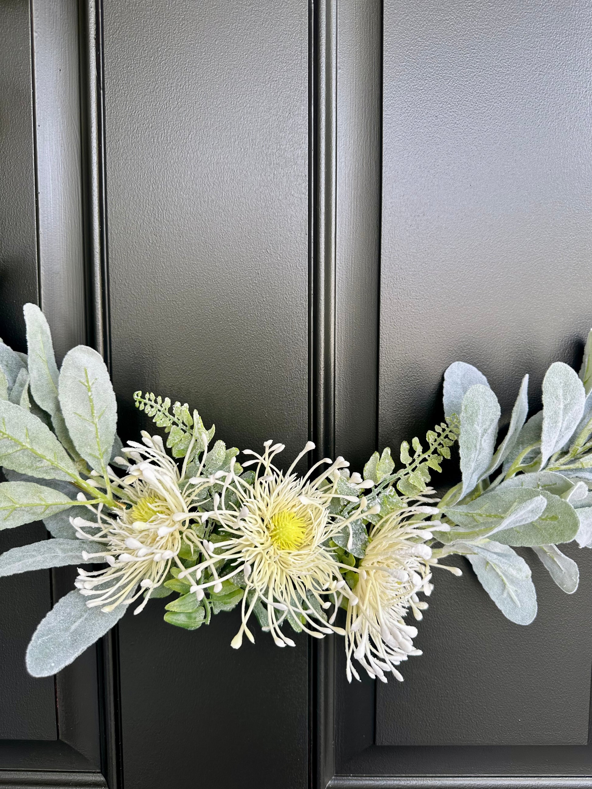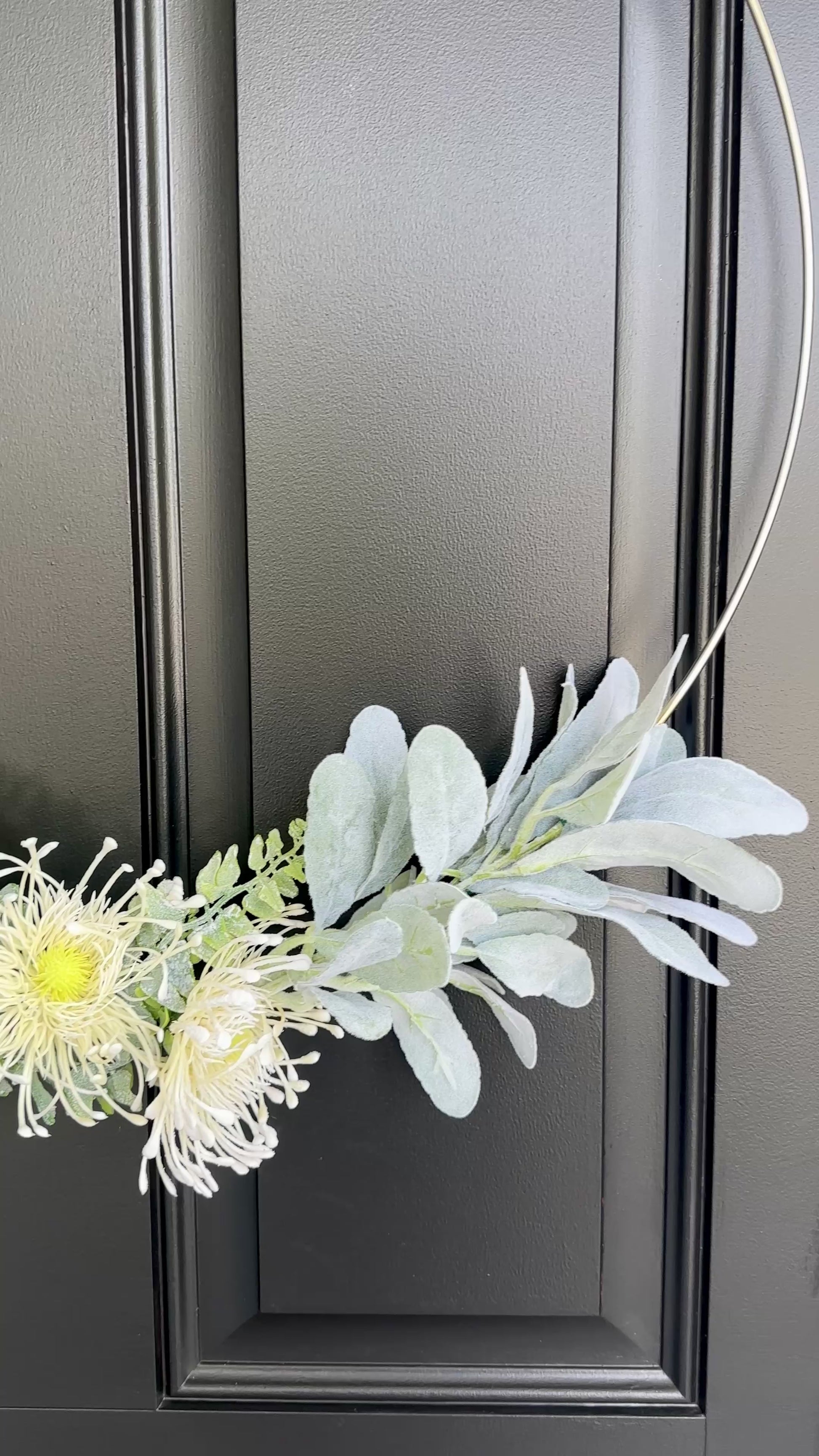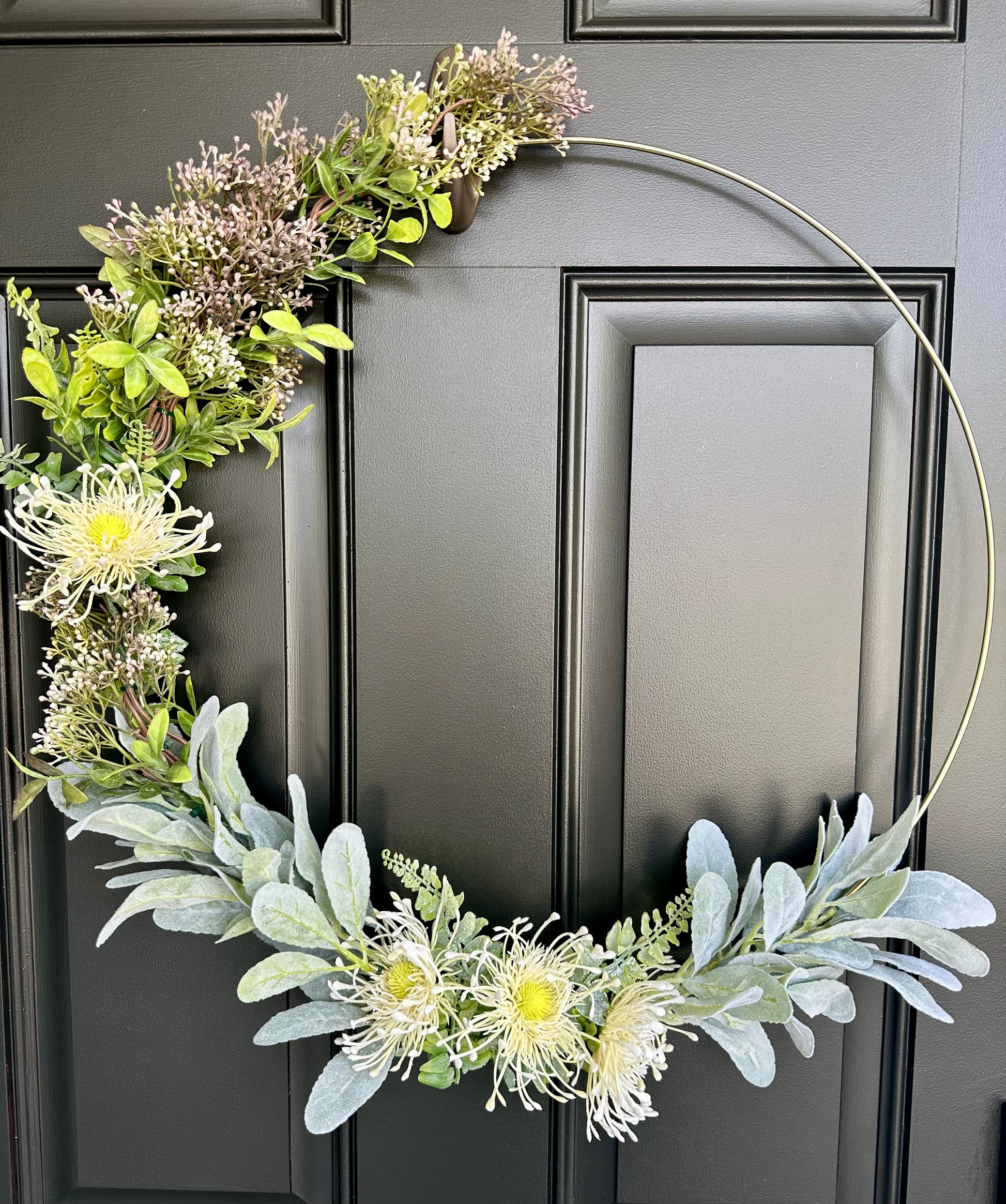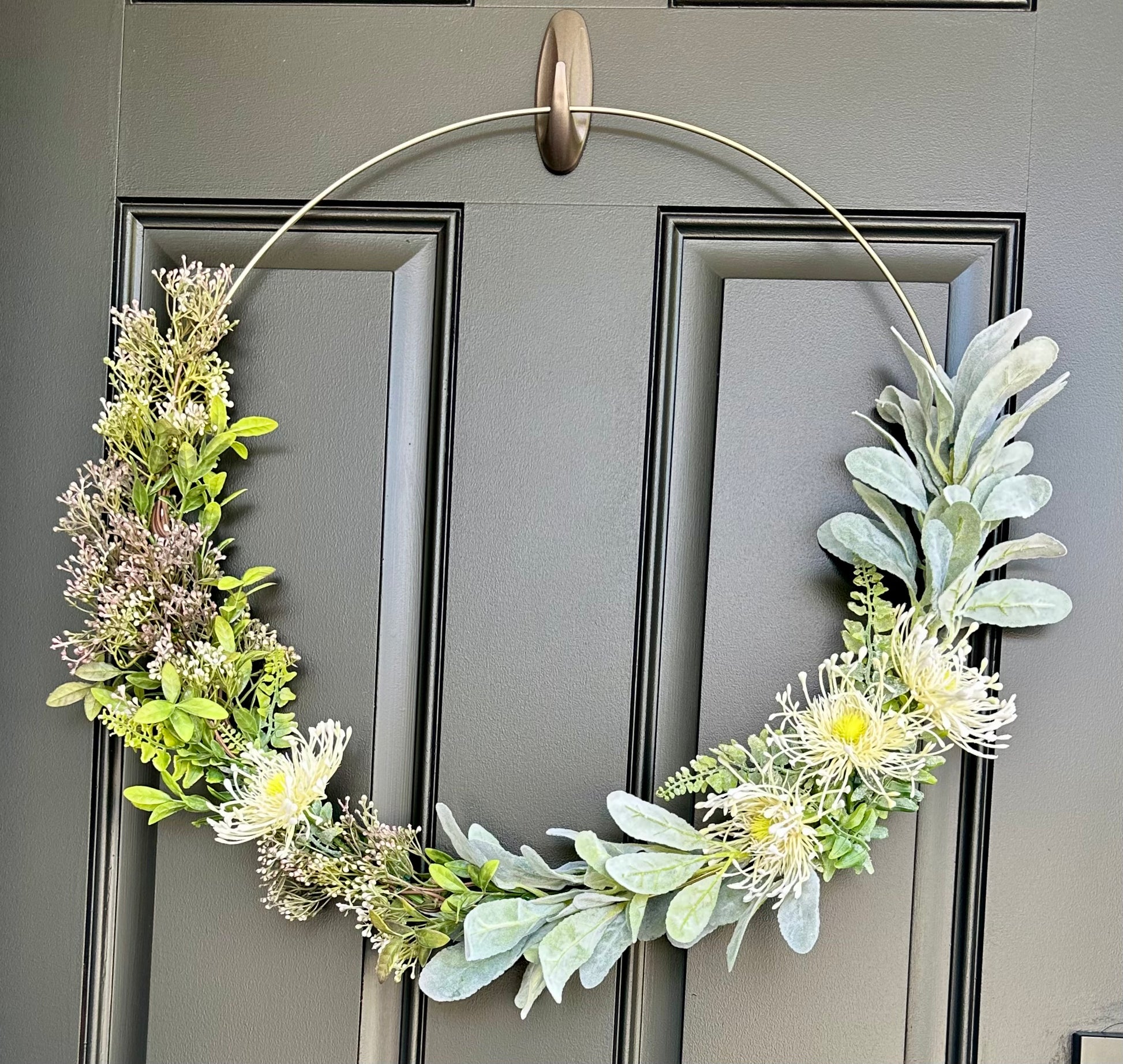 Add some greenery to your space with our handcrafted modern wreath made with faux Lamb’s Ears, Spider mum and seeded bush with white lavender blooms.