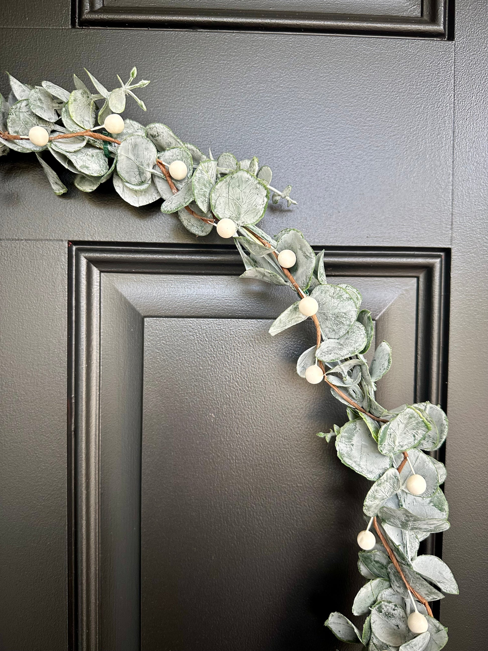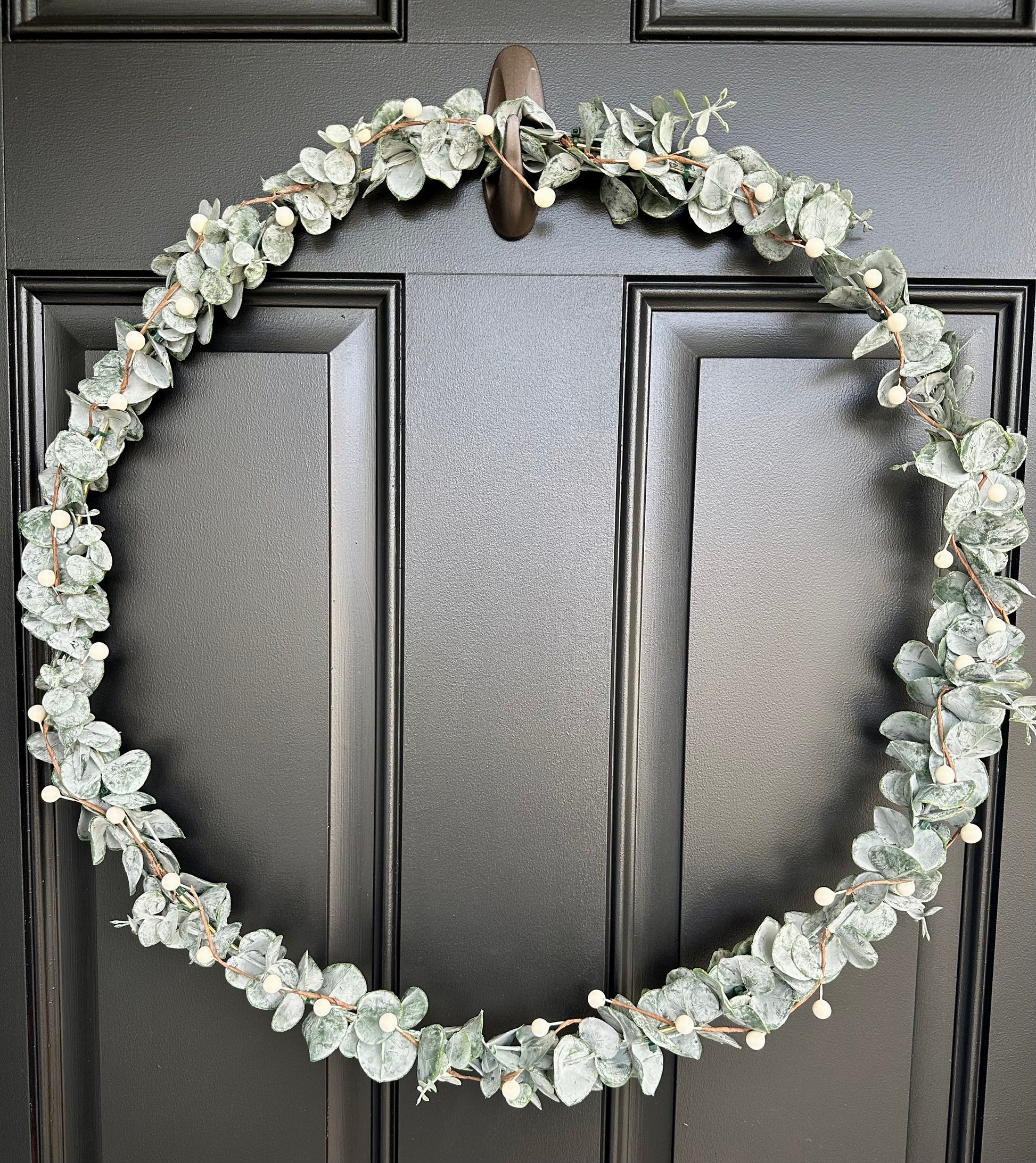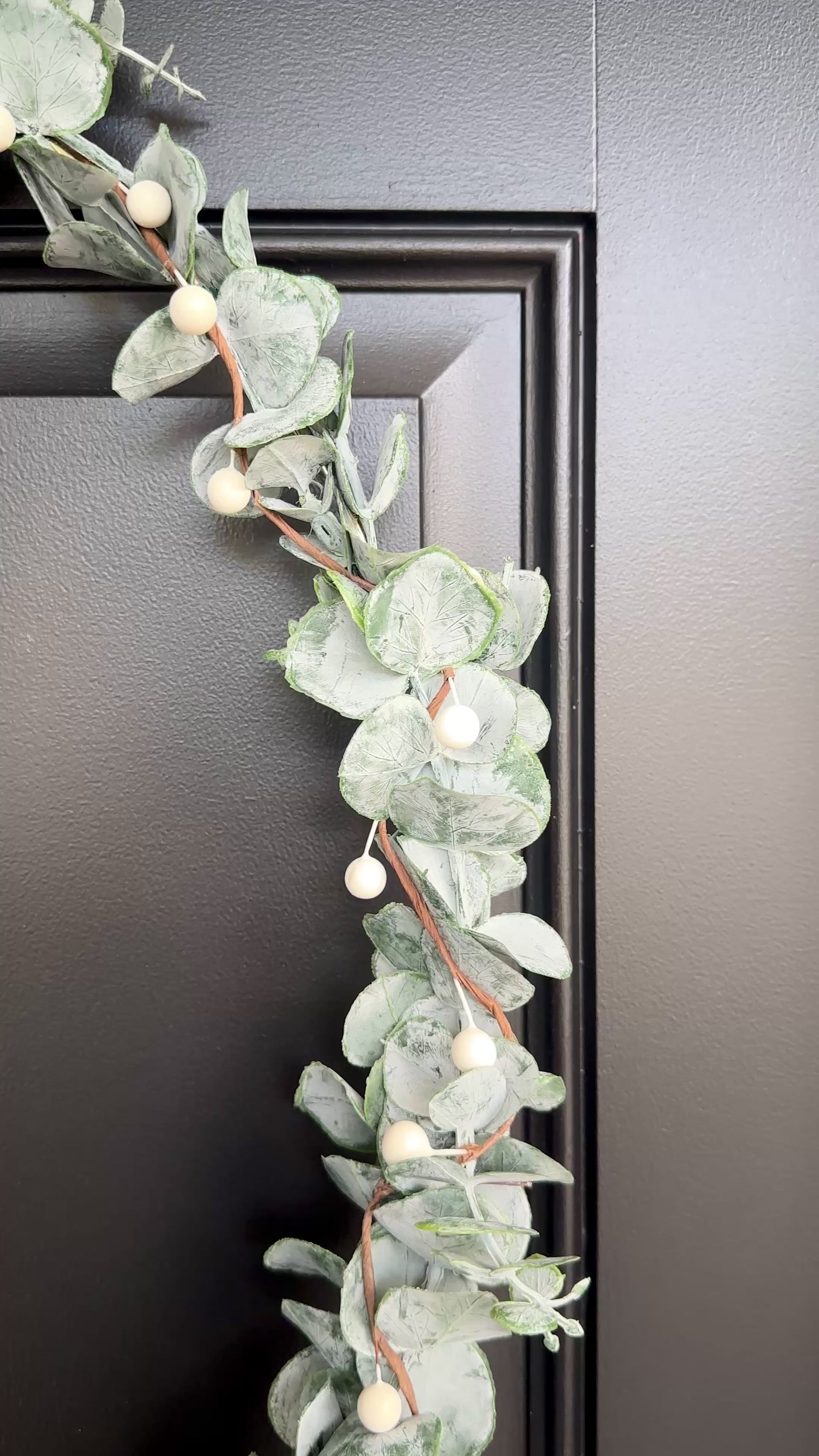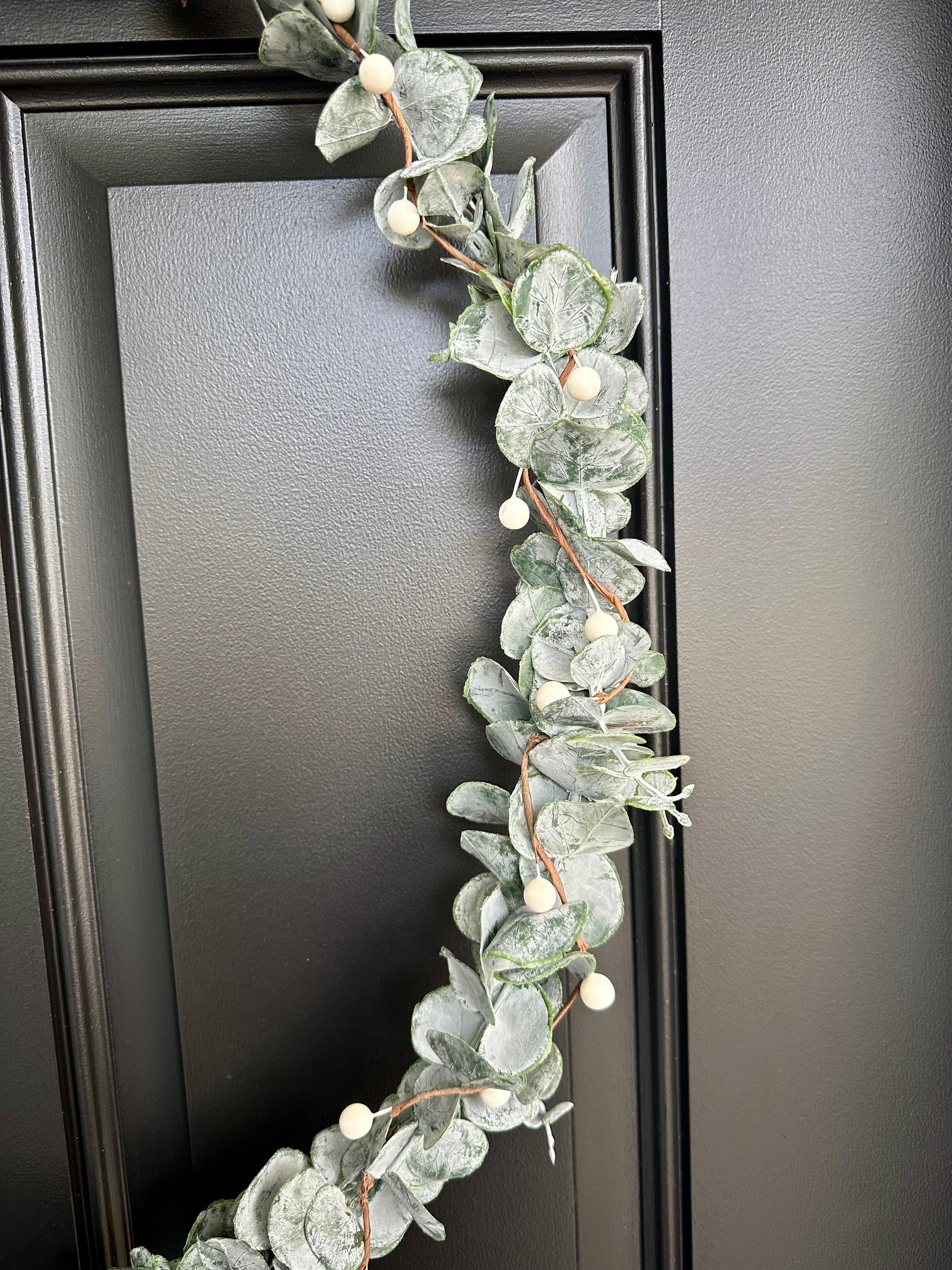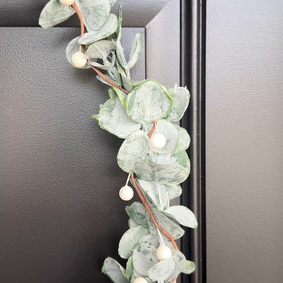 Our simple and elegance wreath is handcrafted to add a touch of greenery to your walls and entryway. Can be displayed seasonally or year round. Made with faux frosted grey green spiral Eucalyptus bush and white pip berry stem.