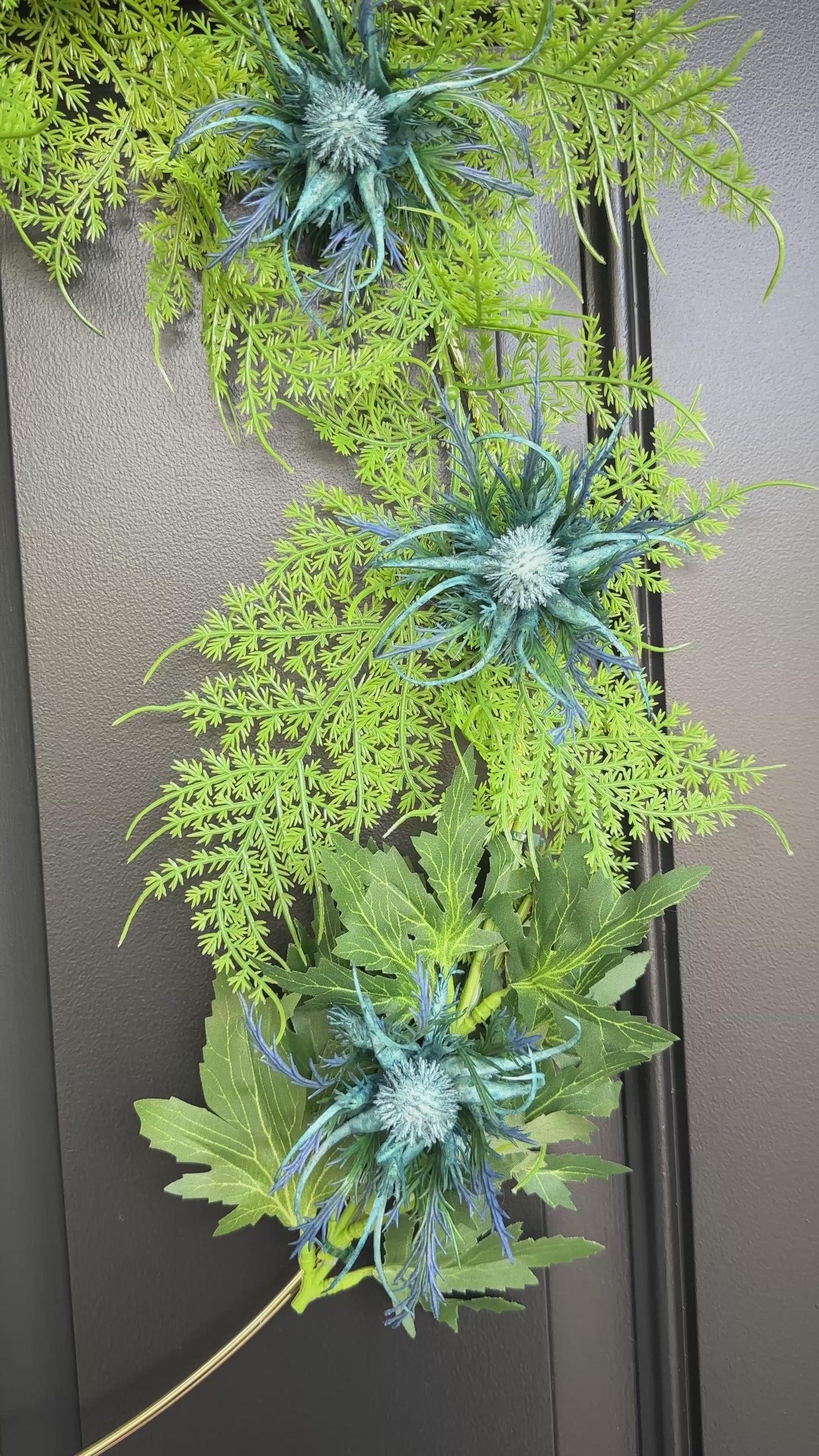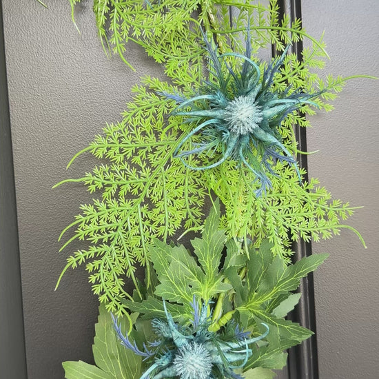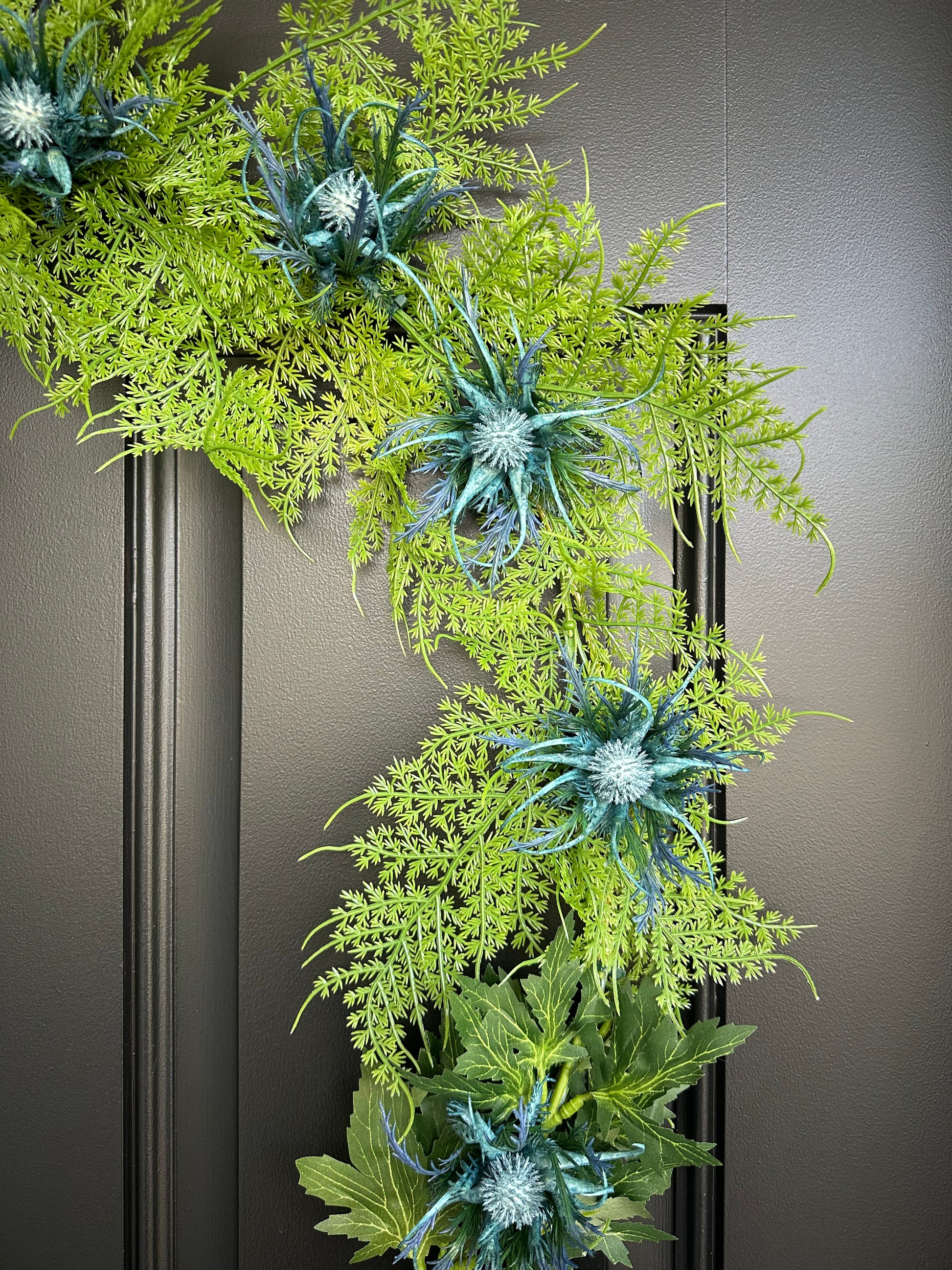 Our beautiful wreath is carefully crafted to add a classic Winter color to your doors, walls and seasonal decor. Made with faux eryngium flowers in rich shades of blue and wispy styled green fern bush.