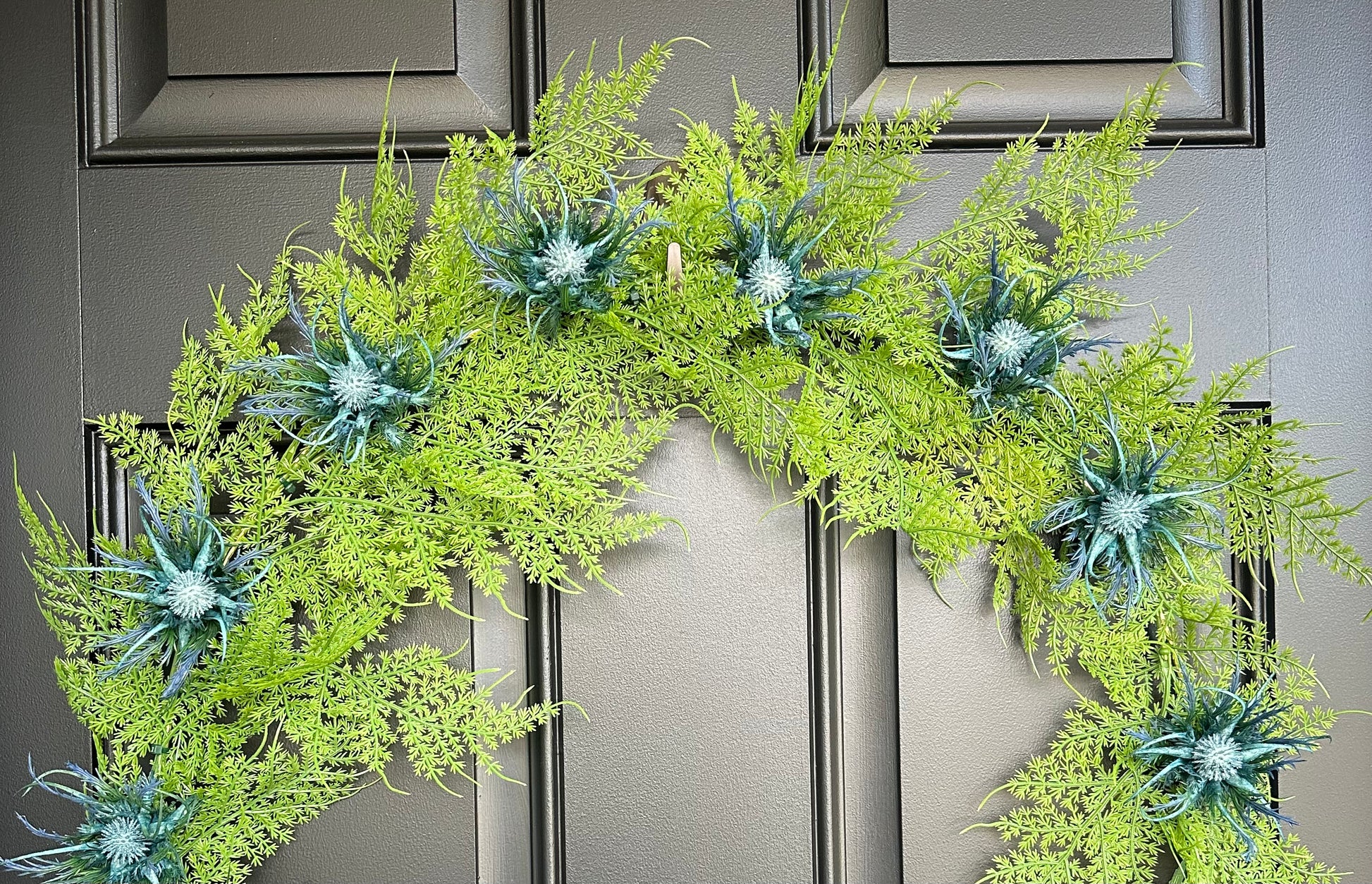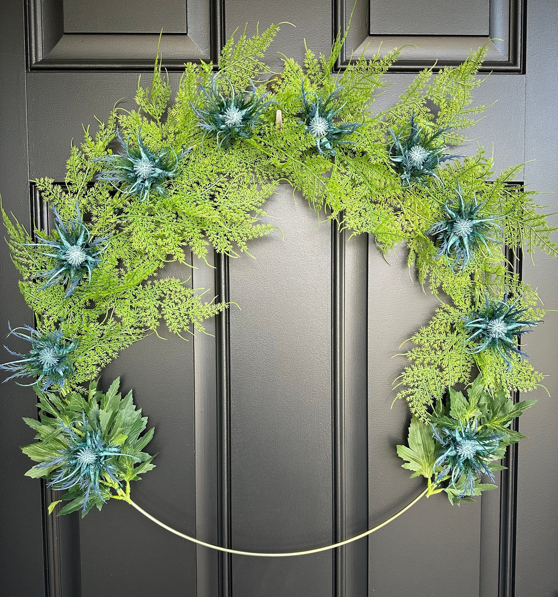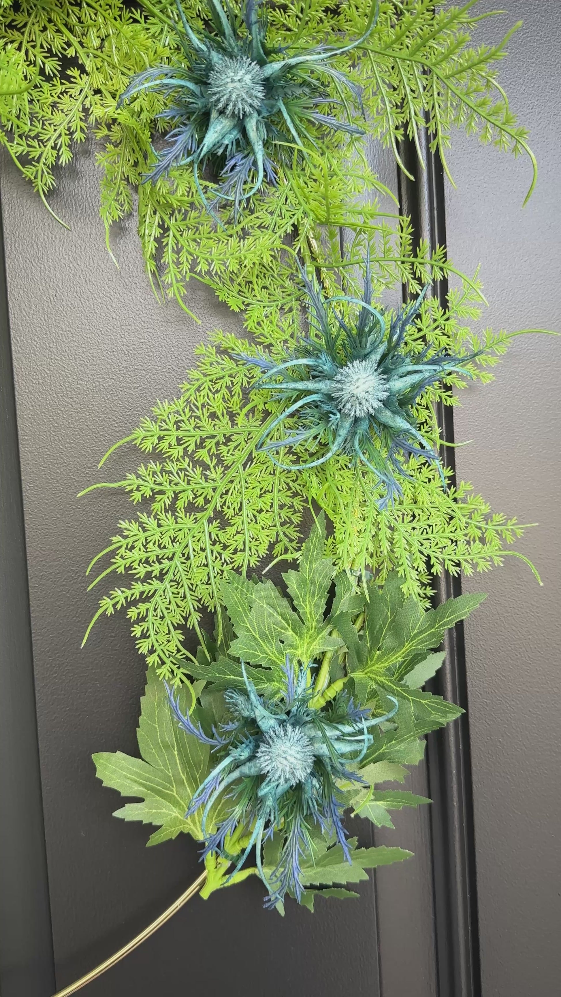 Our beautiful wreath is carefully crafted to add a classic Winter color to your doors, walls and seasonal decor. Made with faux eryngium flowers in rich shades of blue and wispy styled green fern bush.